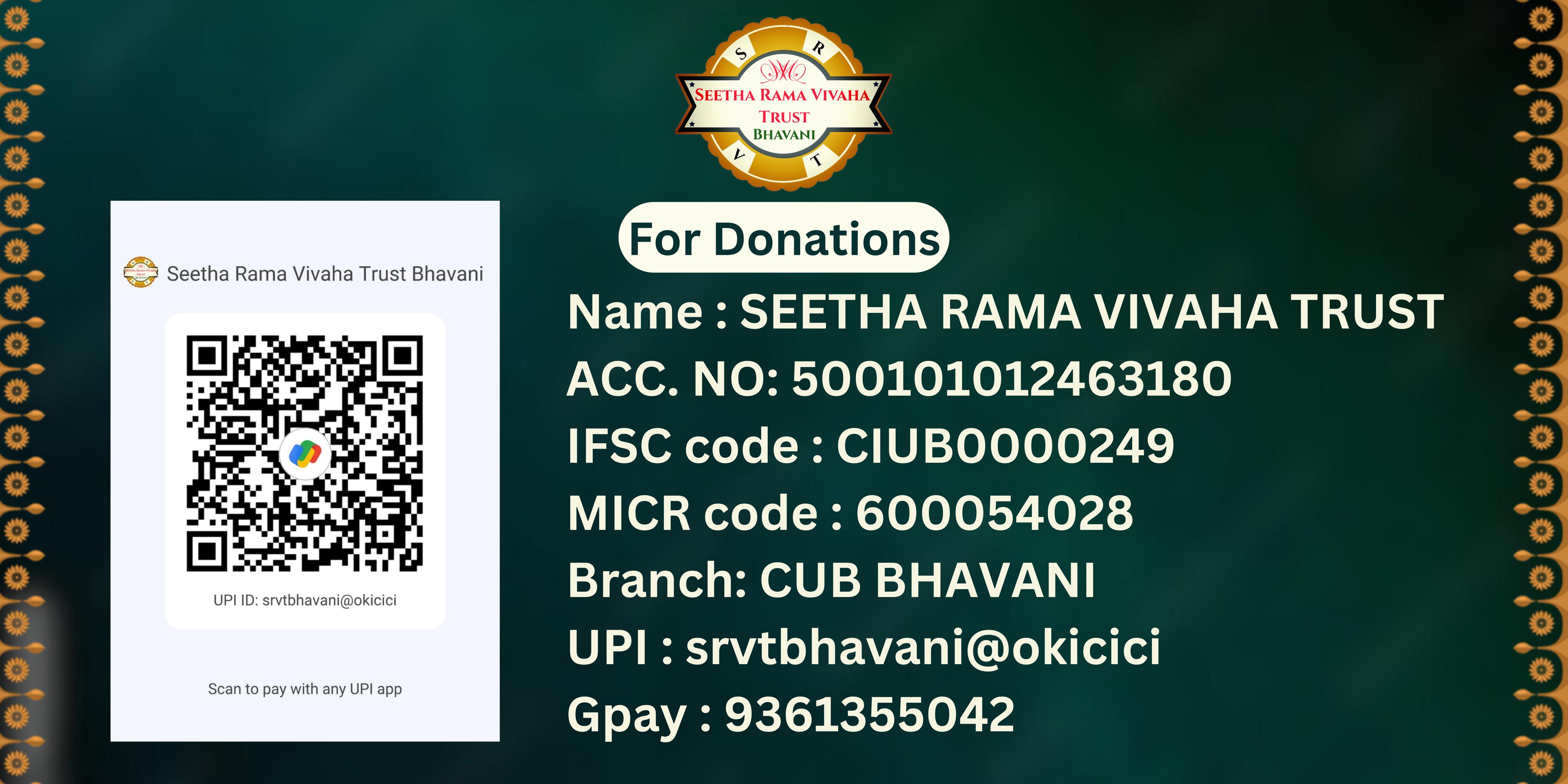 Seetha Rama Vivaha Trust (SRVT) is a registered charitable trust to organise Seetha Rama Vivaha Mahotsavam in Bhajanai Sampradhaya Paddathi at Bhavani every year during the month of July by engaging eminent Bagavathas group. SRVT honours and rewards senior and downtrodden bagavathas in all categories during the Seetha Rama Vivaha Mahotsavam. SRVT Propagates the effect of namasankeerthanam to all youngsters of existing and next generation by encouraging them to be involved in all type of spiritual functions. SRVT provides assistance to public due to sufferings happen by natural calamities irrespective of casts, sex and religion. The Benifits of the trust are open to all irrespective of caste, sex, etc. and the trust will not carry on any activity with an intention of earning profit.